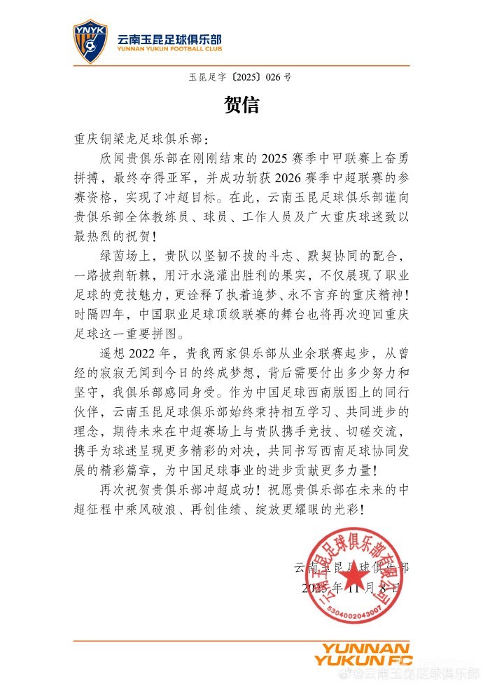 北京时间11月8日,中甲第30轮赛事圆满收官。重庆铜梁龙在客场以2-0的比分力克上海嘉定汇龙,以中甲亚军的荣耀姿态昂首挺进中超。赛后,云南玉昆足球俱乐部向重庆铜梁龙足球俱乐部发出了热情洋溢的贺信。贺信重庆铜梁龙足球俱乐部:喜闻贵俱乐部在2025赛季中甲联赛上奋勇争先,终获亚军殊荣,并成功锁定2026赛季中超联赛的入场券,圆满实现了冲超夙愿。在此,云南玉昆足球俱乐部向贵俱乐部全体教练、球员、工作人员
